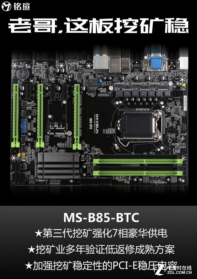 现在装机挖矿又再鼓起,而新的B150、B250在挖矿方面的体现并不如以往的B85、H87,因而铭瑄现已决定要从头“复生”这款4年前的“挖矿神器”,新神器换成B85芯片,命名MS-B85-BTC,它在老神器的基础上做调整,去掉miniPCIe等我们不需求的规划,一起晋级用料,力求在保证安稳性的一起给我们更具性价比的挑选。