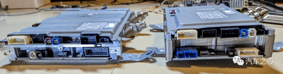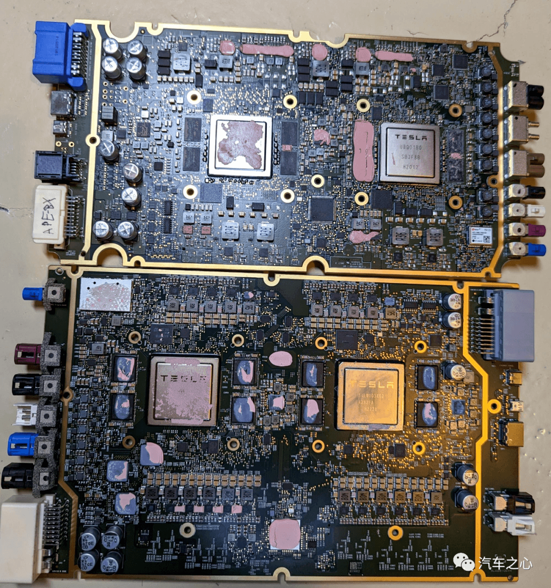左图是 HW3.0 的智能驾驶接口。右图是 HW4.0,上面一层是 HW4.0 的智能驾驶的接口,座舱有两个显示屏输出接口。