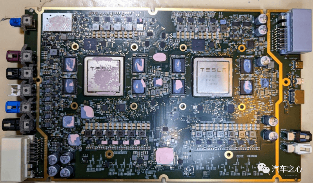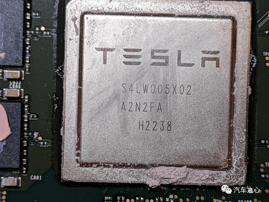 特斯拉二代 FSD 芯片真身,根据芯片表面丝印的数字,编号H2238,可以推断出这是三星代工,并且非常有可能只是7 纳米,不是 5 纳米。
