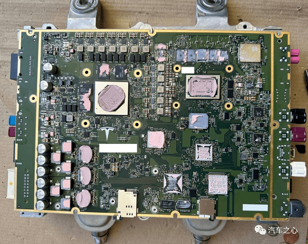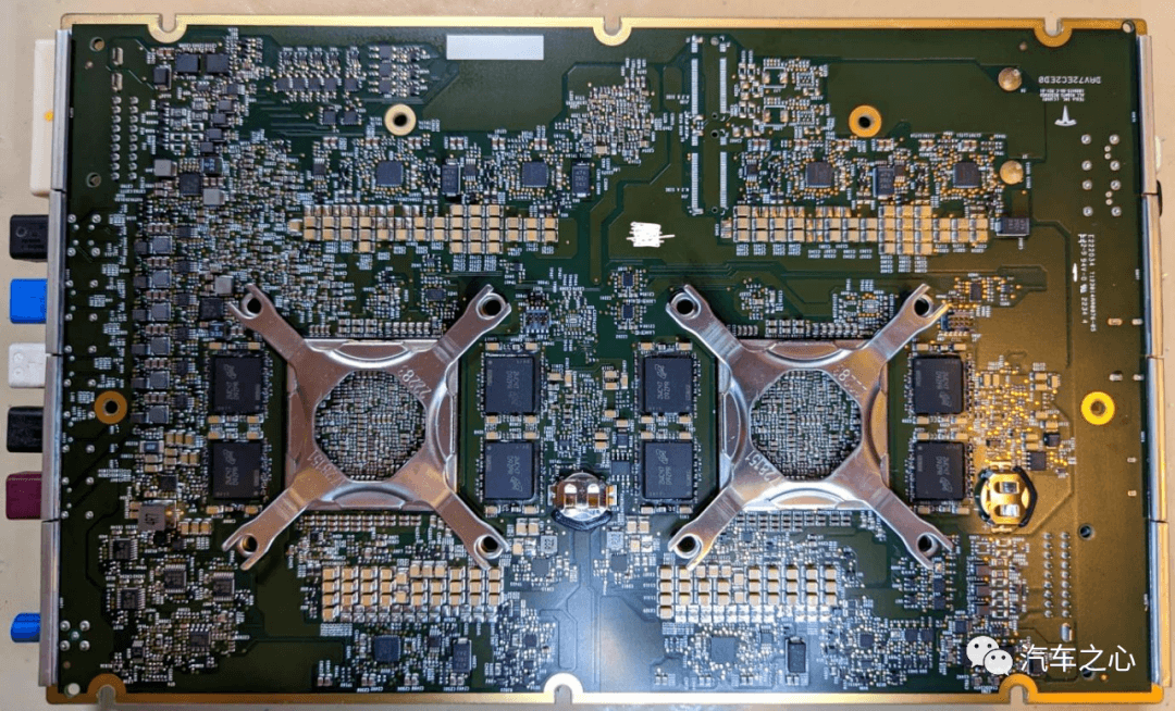 特斯拉使用了 24 相供电(估计两颗 FSD 是 18 路,6 路是显存的),尽管采用了水冷,推测两颗 FSD 的功率仍然有大约150-200瓦。