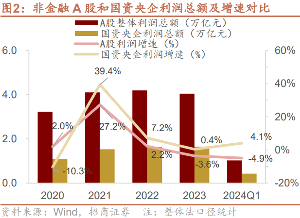 2024年一季度,A股业绩仍承压,国资央企盈利改善趋势较突出。根据整体法测算并剔除金融行业,A股上市国资央企2023年营收增速及总利润增速下降,分别为1.4%、0.4%,但仍保持正增长。2024年一季度,在A股整体业绩承压的背景下,国资央企盈利呈现较突出的改善趋势,营收增速、总利润同比增速分别达2.9%、4.1%。