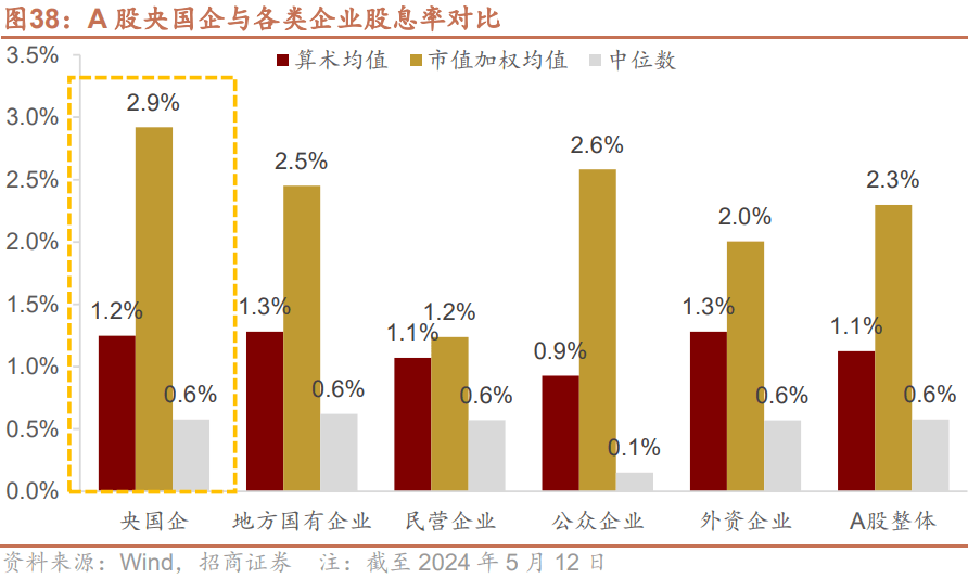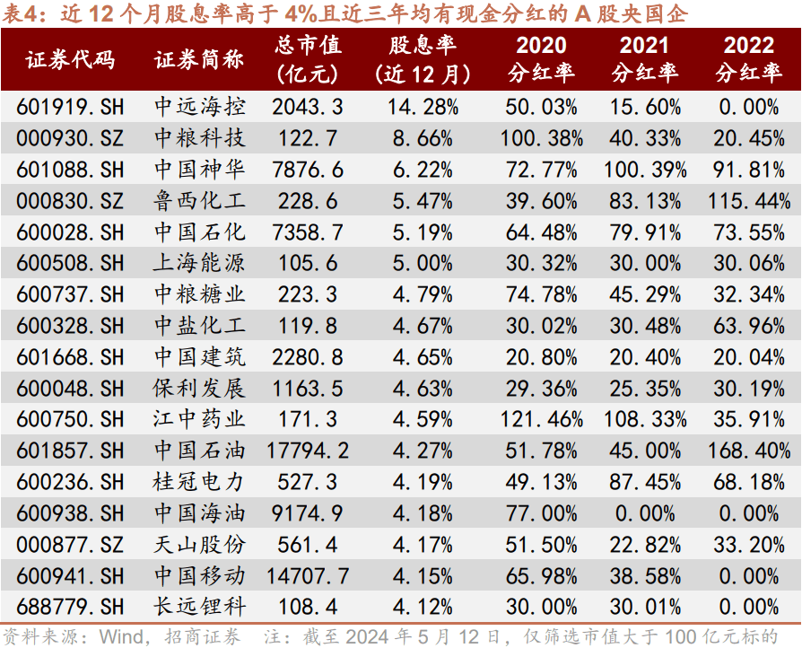 截至2024年5月12日,A股央国企股息率的算术均值、市值加权均值、中位数分别为1.2%、2.9%、0.6%,均高于A股整体、民营企业和公众企业。其中,中远海控、中粮科技、中国神华等市值高于100亿元的央国企,近三年均有现金分红且近12月的股息率高于4%。