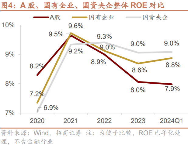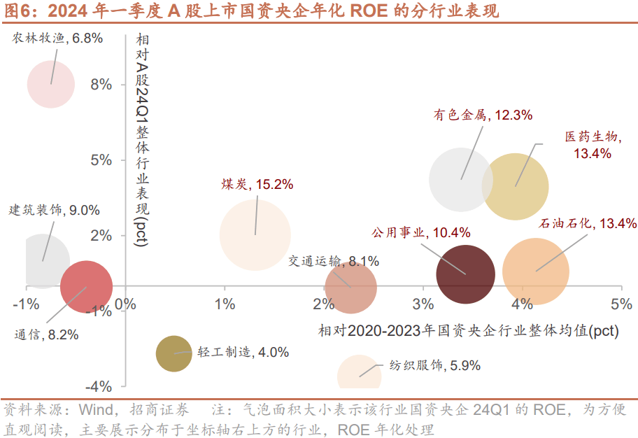 煤炭、石油石化、医药生物、有色金属、公用事业五个行业的国资央企ROE横向纵向比较中表现较突出。分行业来看,2024年一季度煤炭、石油石化、医药生物、有色金属、公用事业等五个行业的国资央企年化ROE整体分别超10%,不仅纵向对比中高于自身2020-2023年ROE均值,横向对比中也高于A股同行业24Q1的整体表现,年化ROE分别达15.2%、13.4%、13.4%、12.3%、10.4%。