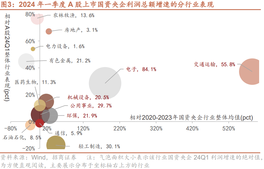 一季度,电子、交通运输、公用事业、机械设备、环保等五个行业的国资央企总利润增速表现较突出。分行业来看,2024年一季度电子、交通运输、公用事业、机械设备、环保等五个行业的国资央企总利润同比增速整体超20%,不仅纵向对比中高于自身2020-2023年总利润增速均值,横向对比中也高于A股同行业24Q1的整体表现。