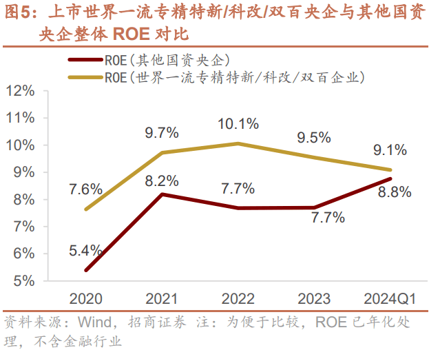 国资央企的2023年报及2024年一季报均已公布,随着价值创造能力的提升,在A股整体业绩承压的背景下,非金融国资央企的利润增速、ROE的相对优势越来越明显。2024年一季度,电子、交通运输、公用事业、机械设备、环保等五个行业的国资央企利润增速较高,煤炭、石油石化、医药生物、有色金属、公用事业等五个行业的国资央企ROE较高。