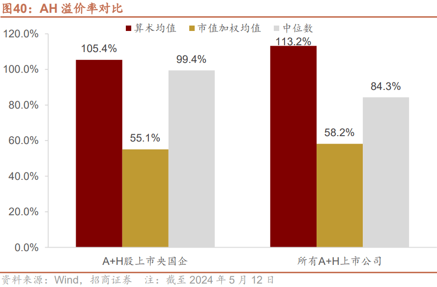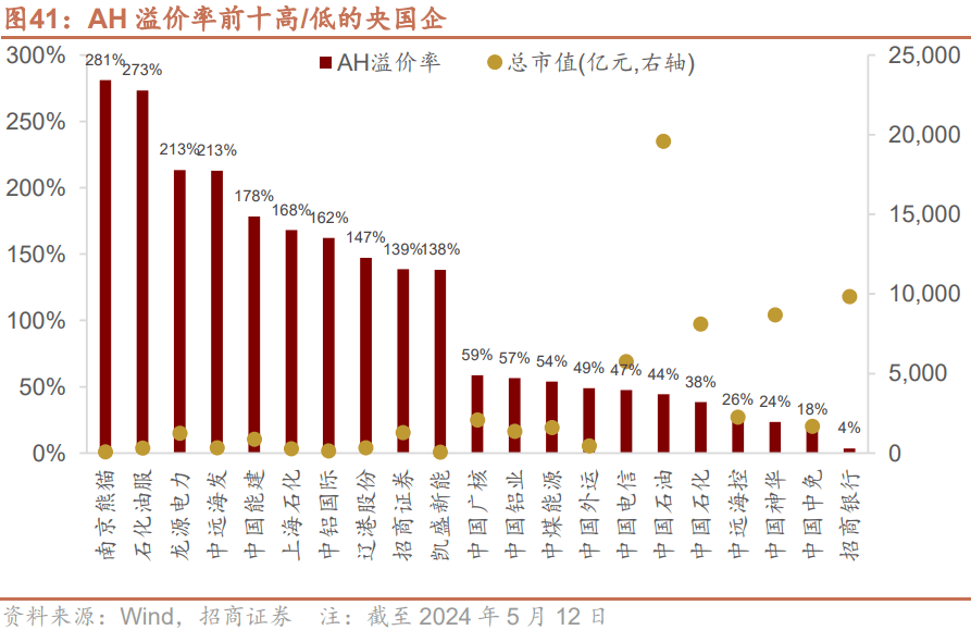 截至2024年5月12日,相较于所有采用A+H方式上市的企业,A+H上市的央国企 AH溢价率较为相近。其中,南京熊猫等十家央国企AH溢价率最高,中国中免等十家央国企AH溢价率最低。